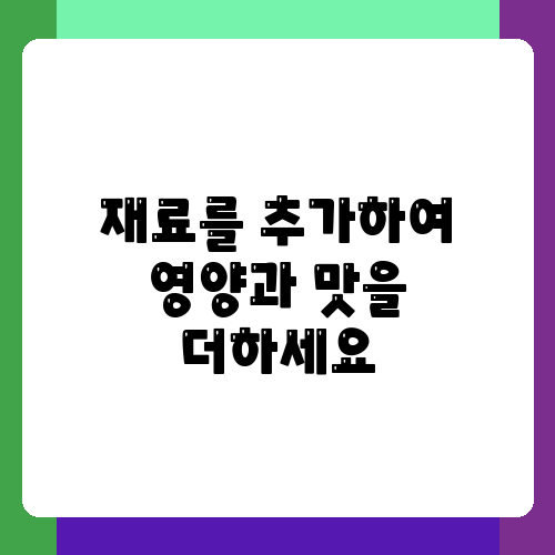 기본적인 흰죽에 다양한 재료를 추가하여 영양과 맛을 더할 수 있어요. 아이가 좋아하는 야채를 곱게 다져 넣거나, 참깨, 들깨가루를 넣어 고소함을 더할 수 있습니다. 단호박이나 고구마를 넣어 달콤한 맛을 더해도 좋고요. 혹시 아이가 야채를 잘 먹지 않는다면, 미세하게 다져서 넣으면 좋습니다. 너무 큰 야채 조각은 아이가 먹기 어려울 수 있으니까요. 또한, 간을 할 때는 소금 대신 멸치 다시마 육수를 사용하면 감칠맛을 더해주면서 자극적이지 않게 끓일 수 있습니다. 아이의 나이와 건강 상태에 맞춰 재료를 선택하고 양을 조절하세요.